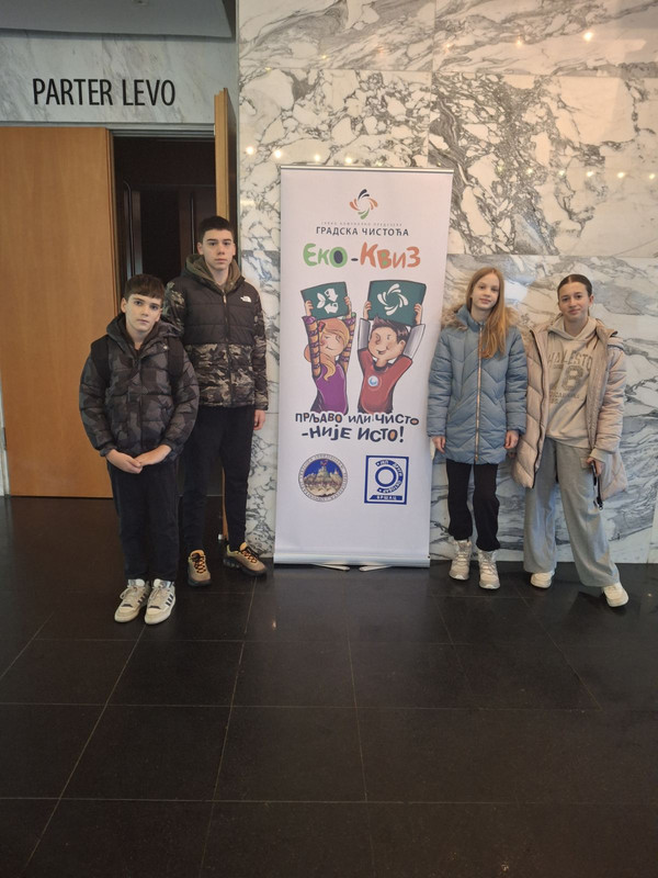 У среду 26. новембра 2025. године одржано је полуфинално такмичење Еко квиза "Пљаво или чисто- није исто!". Такмичење је уприличено у Конгресно-музичкој дворани Центра "Миленијум", а нашу школу представили су ученици Александар Ружанов V1, Теодора Петровић VI3, Лана Орта VII2 и Виктор Влах VIII2. Екипу је припремала и бодрила наставница биологије, Наташа Самуилов.