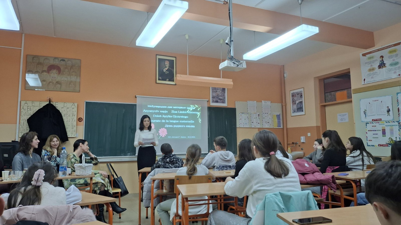 Матерњи језик се може дефинисати као језик наших родитеља и најближих укућана. Такође, можемо рећи да је то језик који смо прво научили или га најбоље говоримо од свих осталих. У савременим друштвима, у којима је говорење само једног језика постало реткост, најважнији фактор у одређивању шта је матерњи језик је наш лични став, а са њим и наша емотивна повезаност са тим језиком. Тако матерњи језик асоцира на нешто што је наше, што нас идентификује и интегрални је део нашег бића. Због тога се сада можемо сетити речи Нелсона Манделе: ,,Ако говориш са човеком на језику који разуме, обраћаш се његовом разуму. Ако говориш са њим на његовом матерњем језику, обраћаш се његовом срцу”. Радионица која је одржана у петак 20.фебруара 2026. у 17 часова покушала је да упозна ученике који су јој присуствовали са лепотом и многобројношћу различитих матерњих језика. Наш програм се састојао од следећих сегмената: 1. Шта је матерњи језик? Даниела Радосав Николић, наставница српског језика и књижевности 2. Приче наших гошћа на својим матерњим језицима 3. Презентација ученика Алексе Ђуре који похађа слободну наставну активност Медијска писменост 4. Кратак видео о словенским језицима 5. Писање лепих речи на различитим језицима свих учесника радионице Посебну захвалност дугујемо нашим драгим гошћама, мамама наших ученица и ученика које су дошле да нам представе лепоту мелодије својих матерњих језика. Владислава Моника Радичевић нам је испричала бајку „Црвенкапа“ на мађарском језику у којој су ученици препознали различите речи које се користе и у српском језику. Дариа Јоана Тот се сетила духовите анегдоте из свог школовања и представила нам је на пољском језику. Марина Николић нас је на румунском подсетила на басну о лаву и мишу. Олга Мичко Мегрина нам је на руском насликала изглед и живот у савременој Москви, њеном родном граду. Бранка Ђурић Фарге испричала нам је како се нашла у Француској од своје прве године живота и како је снимајући филм о париским ватрогасцима, чији смо део погледали, упознала свог супруга. После ових инспиративних прича, растали смо се са жељом да сви лепо сањамо на свом матерњем језику.